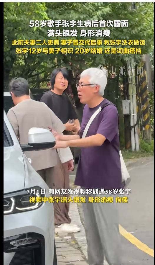 7月1日,据津云新闻,有网友发视频称偶遇58岁张宇,视频中张宇满头银发,身形消瘦、佝偻。与其同行的还有56岁的游鸿明,引发网友对其健康状态的担忧。